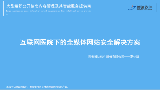 本次云课堂由博达软件业务高级咨询师夏林凯就“互联网医院下的全媒体网站安全解决方案”主题进行专题分享。会议强调,随着等保2.0时代的到来,从多个维度论述了医院网站等级保护的重要性和必要性,结合医院网站发展现状,详细阐述了医院网站安全建设与综合治理之道—对网站系统自身进行安全改造,即医院统一网站群平台建设,加上外围的统一安全防护措施实现内外兼修的网站安全治理。并系统的讲述了博达网站群产品贯穿网站生命周期的安全防护体系,及内在的安全体系架构,博达软件为医院提供完整的网站群规划建设解决方案。最后,夏林凯还向与会嘉宾分享博达贴心服务模式,每一处细节都传达出博达服务至上的经营理念。