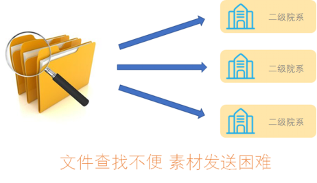 高校包含多所二级院系(部门),宣传部会要求每个单位都进行新闻素材的投递,各单位一般会使用单反或手机拍摄,再导入电脑后通过微信、邮件甚至U盘等老旧的方式,向宣传部发送图片、视频等文件。发送方式较多渠道不统一,且这些渠道对于新闻素材传播来说,具有时效性不强、无法长期保存、传输中压缩等先天的劣势。宣传部还要对这些渠道所接收的资源一一汇总整理,工作步骤较为繁琐很容易出现错误,造成宣传问题,乃至事故 。