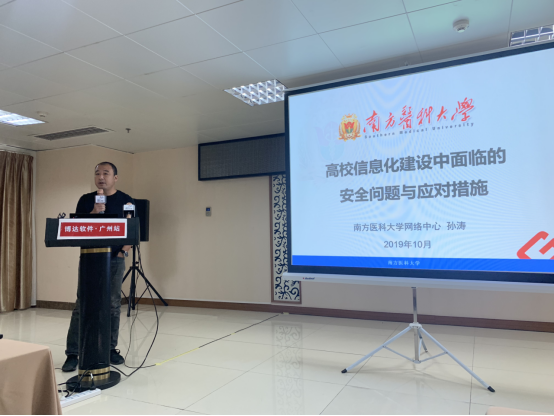 博达软件副总经理王逸杰先生出席此次会议并致开场词,会议中由南方医科大学网络中心孙涛、广东外语外贸大学网络与信息化中心网信中心运行部丘广华主任、广州城建职业UU娱乐城