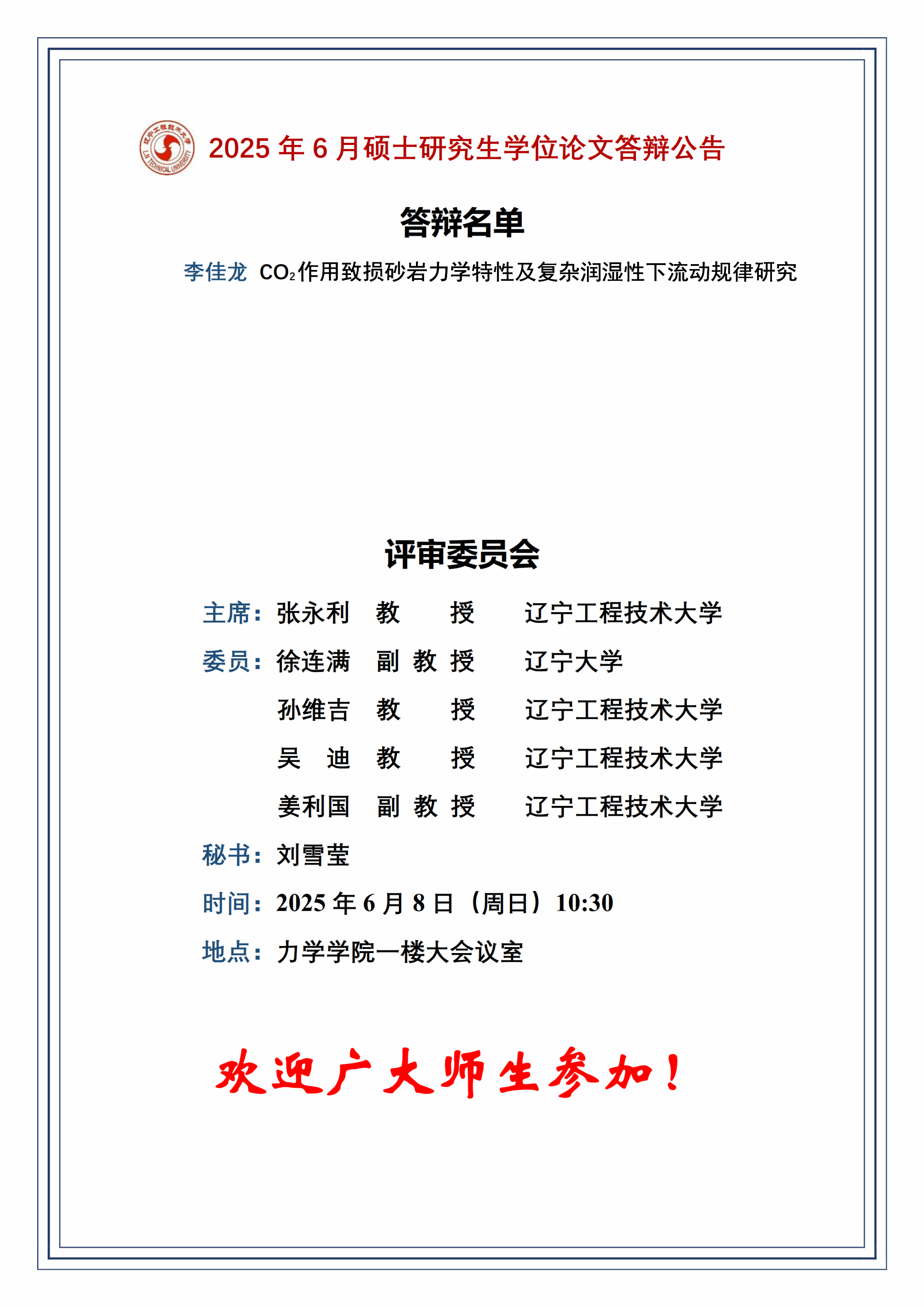 2025年春夏学期硕士学位论文答辩公告(流体力学二组)