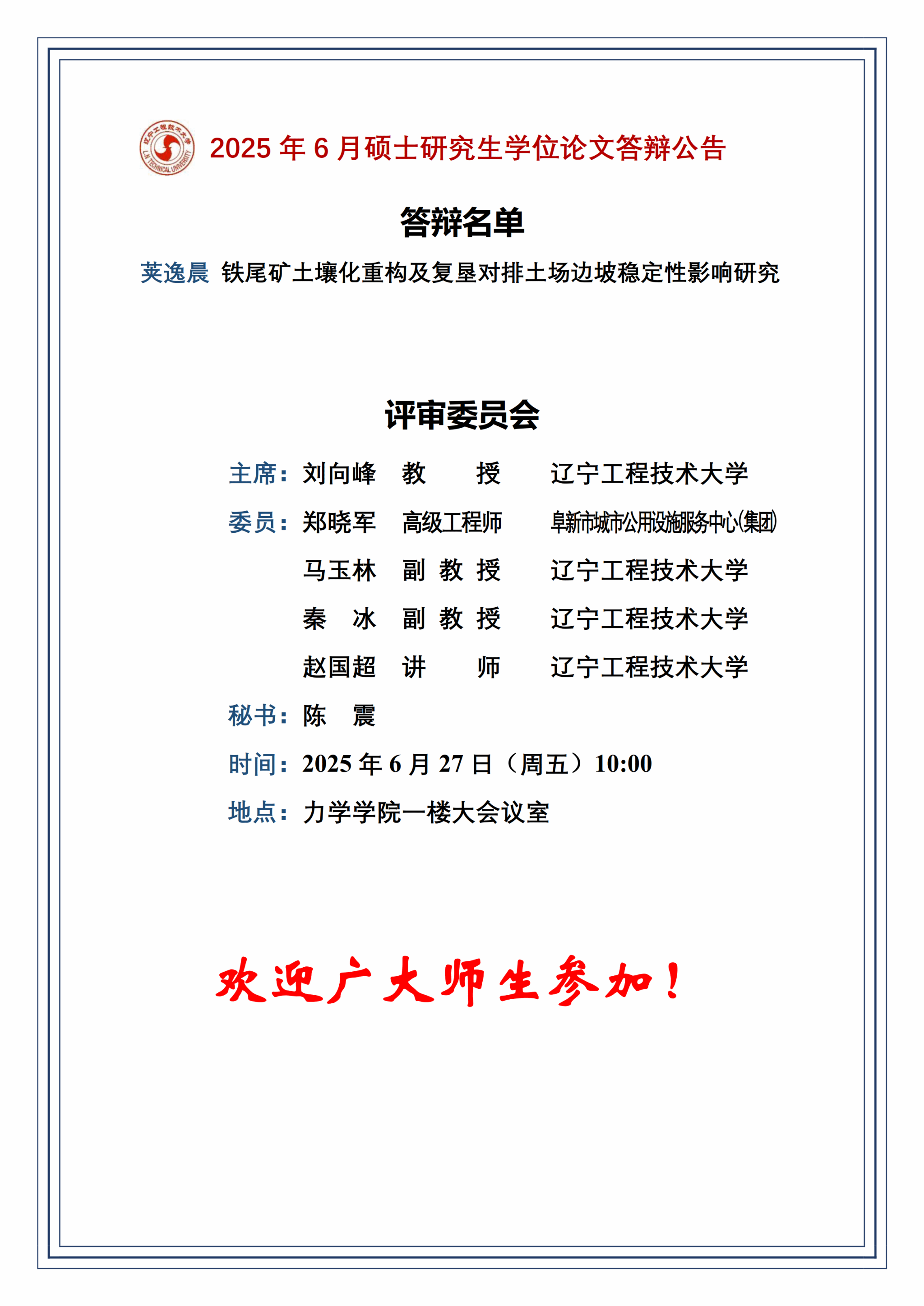 2025年春夏学期硕士学位论文答辩公告(环境岩土力学四组)