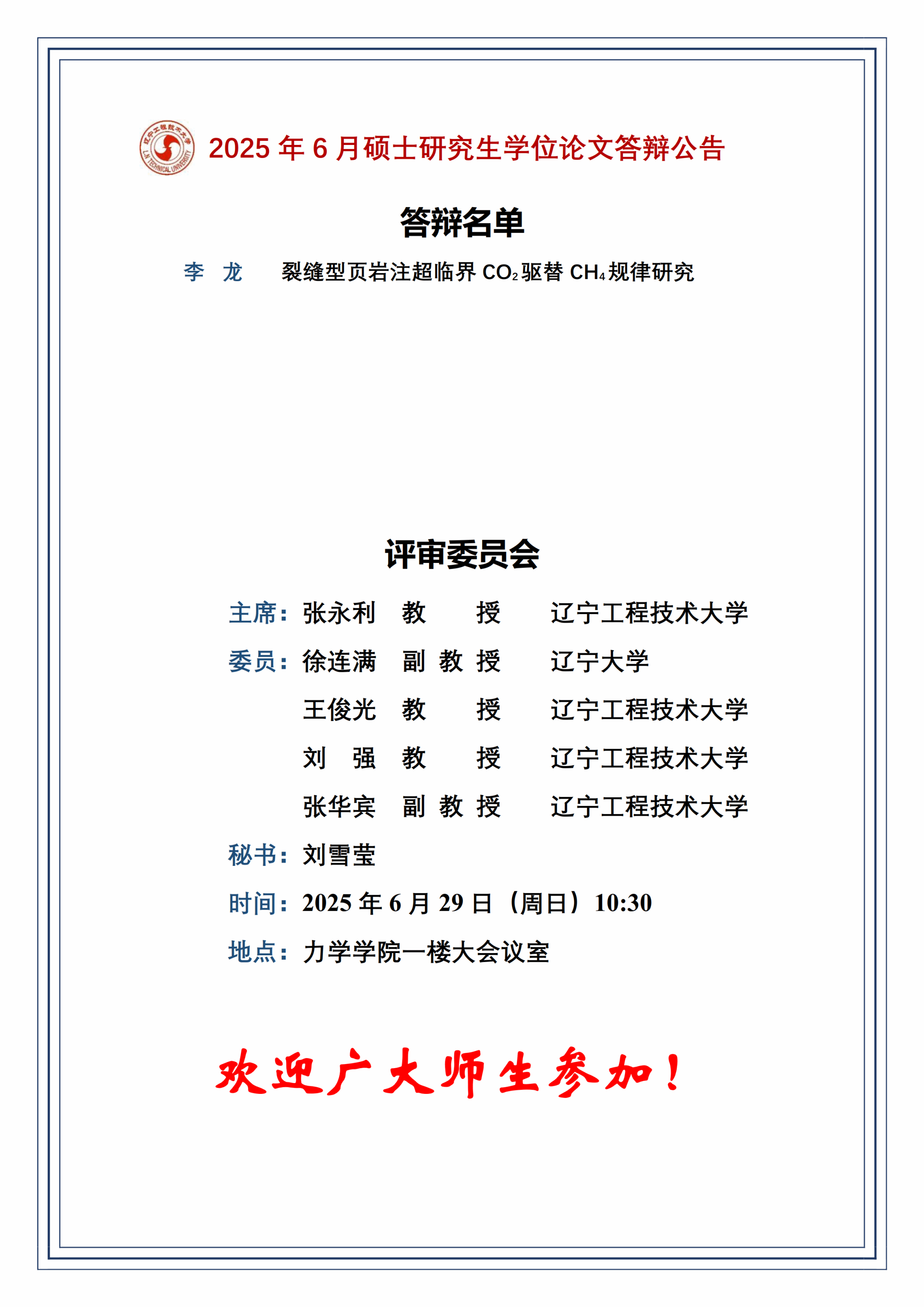 2025年春夏学期硕士学位论文答辩公告(流体力学七组)
