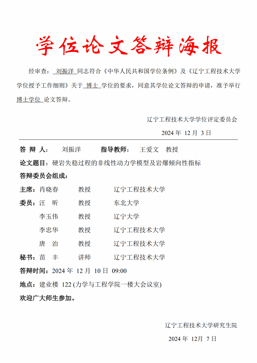 上一条:2025年春夏学期硕士学位论文答辩公告(灾害力学一组)