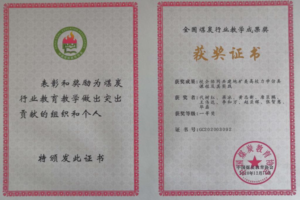 3、全国煤炭行业教学成果一等奖:校企协同共建地矿类高校力学仿真课程及其实践,2020年。