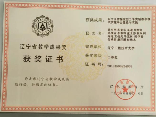 1、辽宁省教学成果二等奖:自主合作探究型力学实验教学模式实施平台建设与实践,2018年。