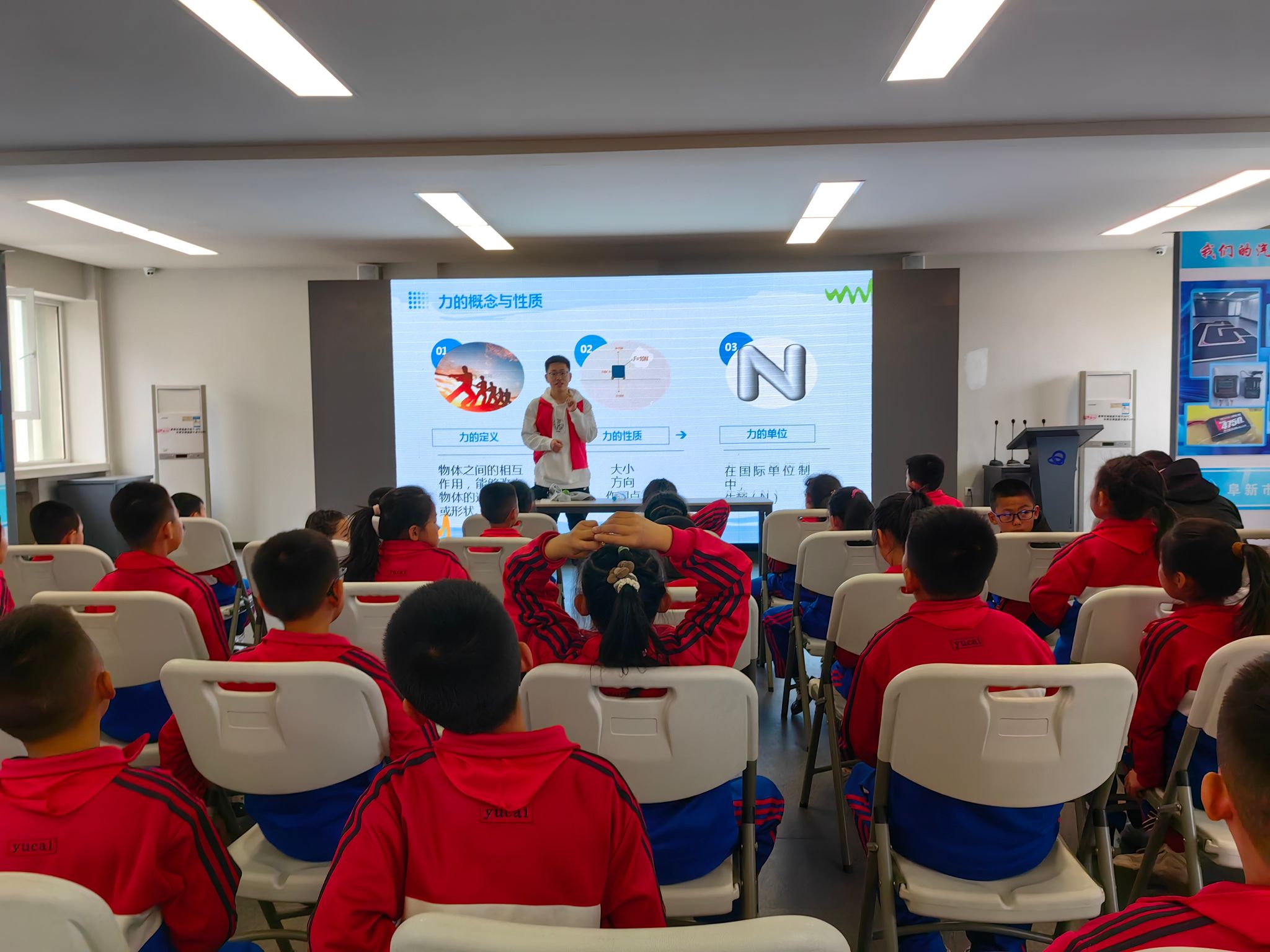 志愿者们迅速投入工作,有的协助主讲人开展演示项目,有的耐心解答小朋友的问题,有的帮助维持秩序保障观众安全,还有的为小朋友介绍各种活动项目。青春洋溢的脸庞,热情饱满的态度,温馨周到的服务,为科技馆增添了一道亮丽的色彩。在“力学探索之旅”小课堂环节,志愿者们从力学基础知识、力的分类、力学实验、生活中力学原理等多个方面进行科普。在动手实验环节,志愿者介绍了拽不开的毛巾奔走的铁环两个有趣的实验,并让学生亲手操作,在实践中掌握其中的力学原理。